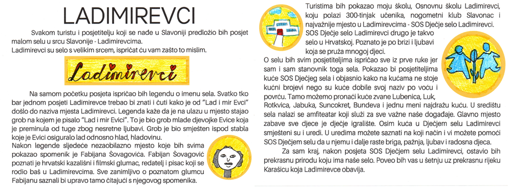 SOS Dječje selo Ladimirevci drugo je takvo selo u Hrvatskoj. Poznato je po brizi i ljubavi koja se pruža mnogoj djeci. O selu bih svim posjetiteljima ispričao sve iz prve ruke jer sam i sam stanovnik toga sela. Pokazao bi posjetiteljima kuće SOS Dječjeg sela i objasnio kako na kućama ne stoje kućni brojevi nego su kuće dobile svoj naziv po voću i povrću. Tamo možemo pronaći kuće zvane Lubenica, Luk, Rotkvica, Jabuka, Suncokret, Bundeva i meni najdražu kuću, kuću Kesten. U središtu sela nalazi se amfiteatar koji služi za sve važne naše događaje. Glavno mjesto zabave sve djece je dječje igralište. Osim kuća u Dječjem selu Ladimirevci smješteni su i uredi. U uredima možete saznati na koji način i vi možete pomoći SOS Dječjem selu da u njemu i dalje raste briga, pažnja, ljubav i radosna djeca.