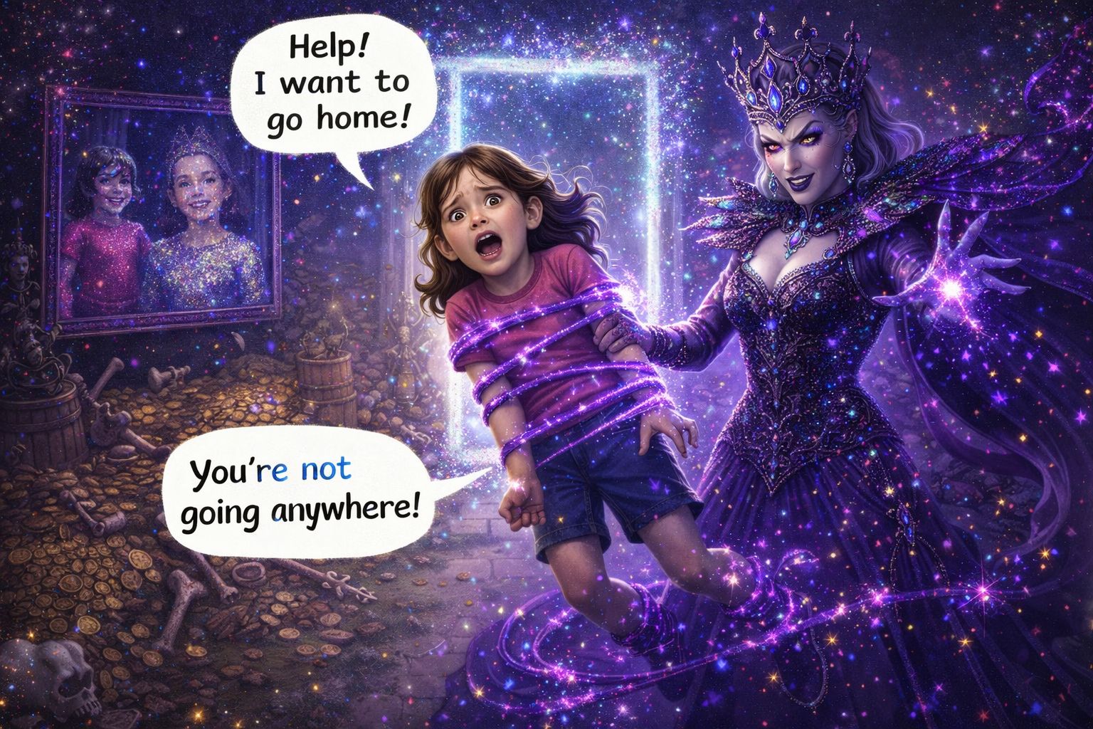 Jednog sunčanog dana bila sam na igralištu. Vidjela sam čudna svjetlucava vrata i prošla sam kroz njih. Unutra sam vidjela čudnu tetu koja je bila puna šljokica. To je bila naša susjeda. Vidjela sam čudnu sliku, a to sam bila ja pokraj čudne osobe. Htjela sam otići iz ovog svijeta , ali nije bilo izlaza. Vikala sam upomoć, upomoć! Netko je došao, a to je bila kraljica koja me zarobila. Rekla je: “Zdravo djevojčice mala, kako si došla?“ Ja sam rekla da sam vidjela šljokičasta vrata. Kraljica je rekla kako je dobro da sam došla jer ima poklon za mene. Ja sam joj rekla da želim otići doma kod svoje mame. Uzviknula je: “Ne ideš ti nigdje!“ Uplašila sam se i rekla da idem iz ovog čudnog svijeta. Počela sam bježati, ali je kraljica pokazala svoje moći. Podigla me, povukla i rekla da neću moći otići nigdje. Htjela me zadržati kao sluškinju. Rekla mi je da očistim smeće. Nisam ju htjela poslušati i napravila sam trik da pogleda dolje, gore, desno i lijevo. Pogledala je i ja sam počela trčati koliko me noge nose. Ugledala sam vrata kroz koja sam ušla i uspjela izaći iz tog čudnog svijeta . Vidjela sam svoju kuću i brzo sam otrčala doma. Mama me vidjela i čvrsto me zagrlila . Bila sam sretna što sam vidjela mamu. Odlučila sam da više neću ulaziti kroz čudna vrata.
