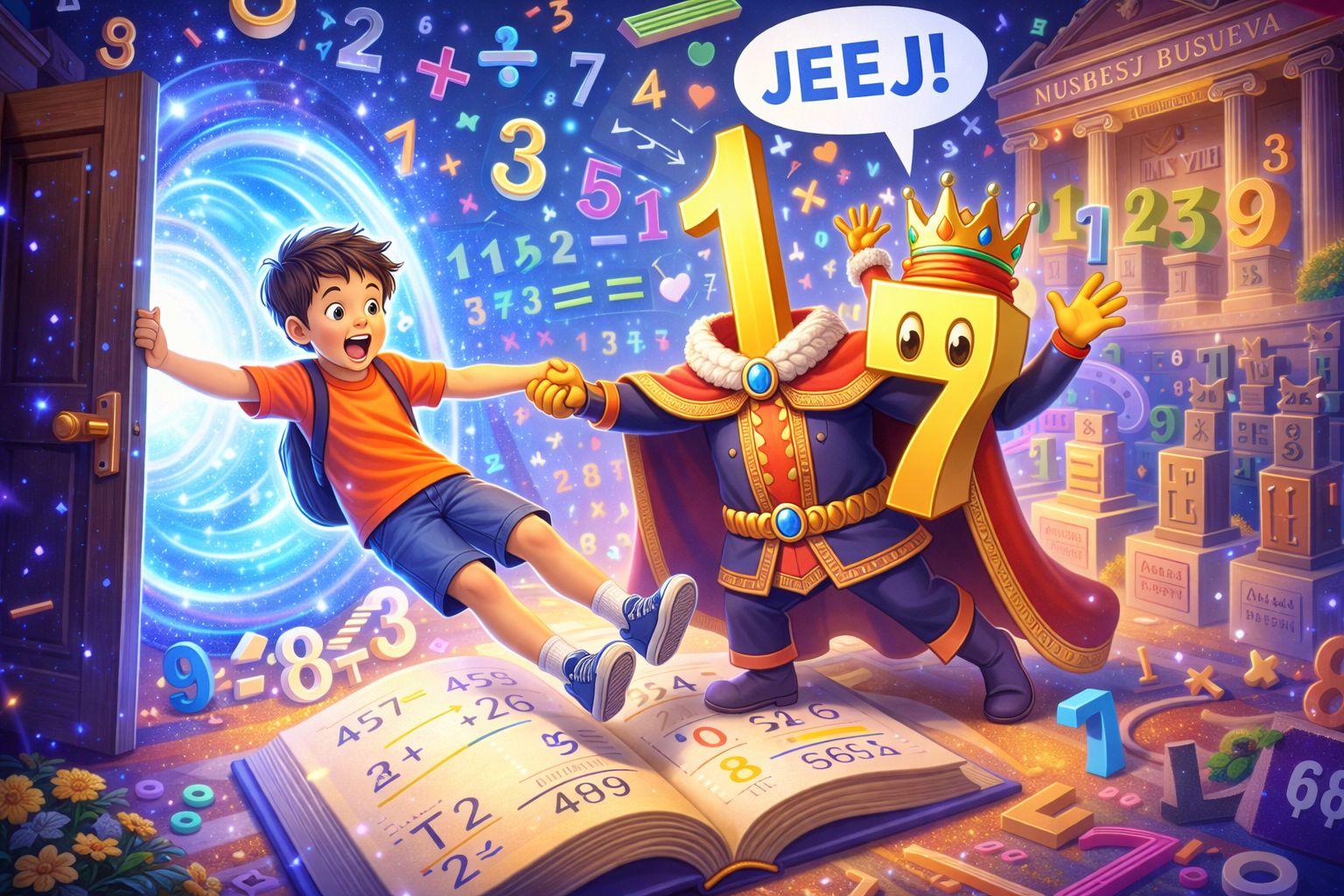 Povukla su me vrata. Ja sam se skoro onesvijestio. Što je ovo? To je svijet matematike. JEEEJ! Igrao sam se pisanim zbrajanjem i oduzimanjem i puta i dijeljenjem . Kralj brojeva je bio sretan i ja isto sam bio sretan. On je vikao JEEEEJ!