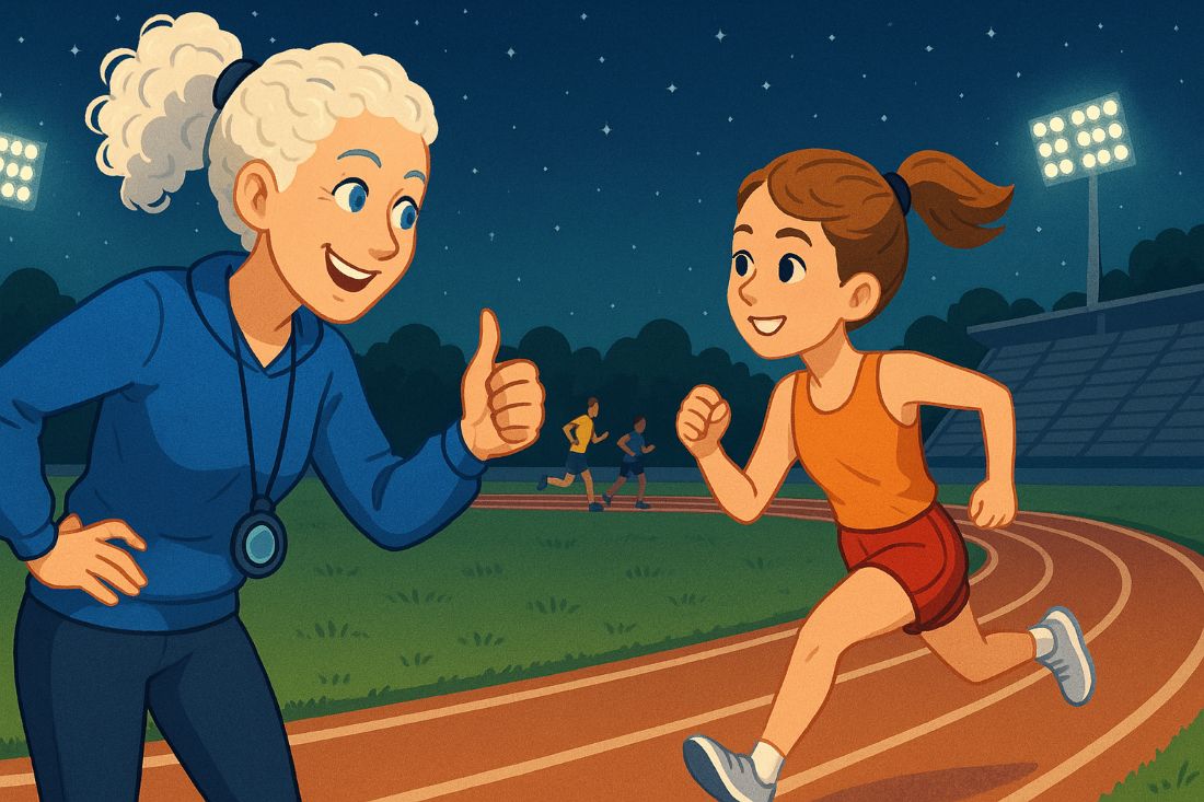 Ona, moja trenerica, trenirala je gimnastiku, a sada me podržava u mom omiljenom sportu- atletici. Ona ima plavu kovrčavu kosu poput mekanog snijega. Svoju kosu voli nositi u repu, a ponekad i u pundži. Krase ju plave oči. Ona je vitkoga stasa poput olovke. Moja trenerica je moj najveći prijatelj i uzor. Volim biti na treningu s njom jer me uvijek motivira.