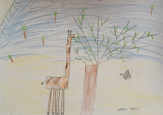 Dok je vrana stajala na grani, vikne žirafa: „Pazi, puca grana!“ Vrana padne i slomi krilo. Žirafa stavi vranu na svoje rogove i odnese je do gnijezda. Žirafa kaže vrani: „Drugi put nemoj se hvaliti i svađati jer kad ti se nešto loše dogodi nitko ti neće pomoći.“