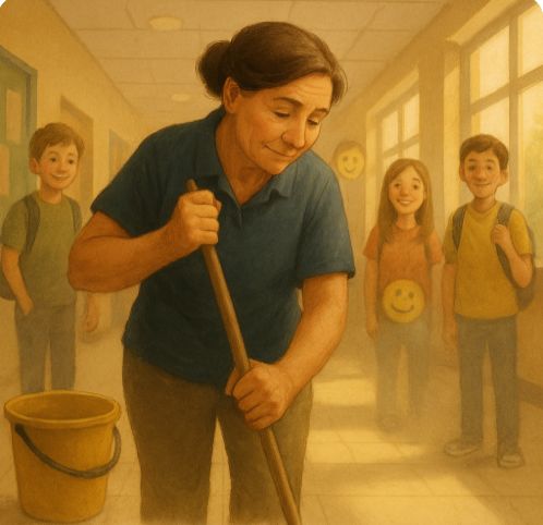 Svaki dan čiste isto. Čiste sve učionice i hodnike. Ne mislite li da im je jako naporno? Sigurno jest. A neki misle da nisu važne. Nije li to bezobrazno? Vidi se i na njima to. nisu baš sretne, bar tako mislim kad svaki dan vidim izraz njihovih lica.
