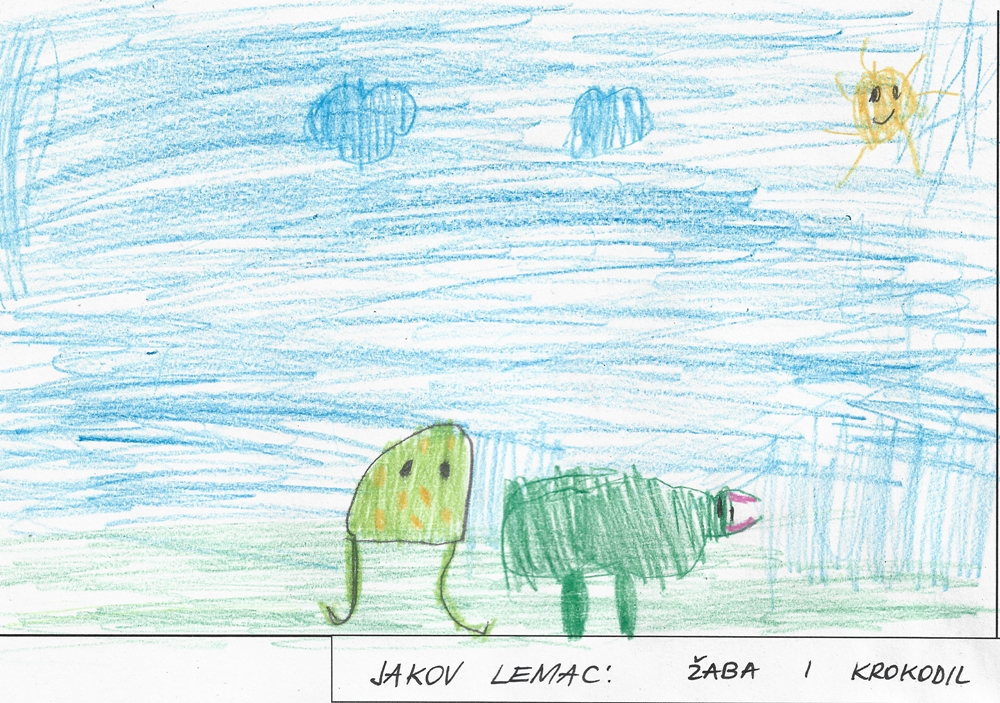 Jedan krokodil bio je u vodi i tu je ugledao žabu. Sprijateljili su se i cijeli dan su se igrali. Nisu htjeli ići u školu nego su se samo htjeli igrati i igrati. Ipak, na kraju dana im je dosadila i igra.