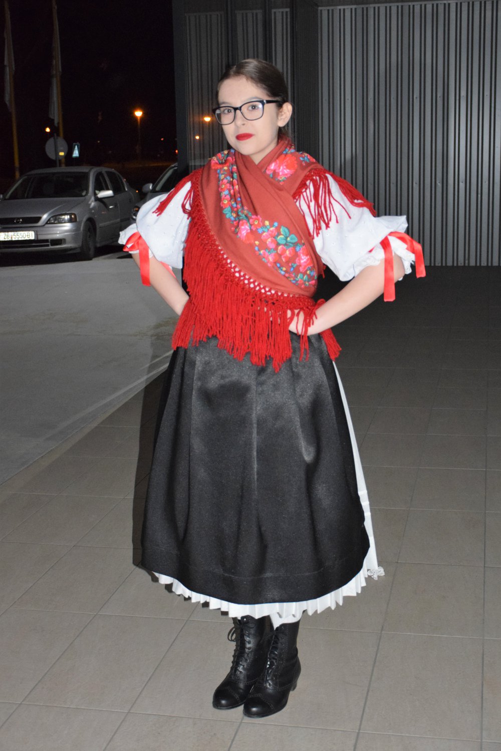 Navek nase prvo oblečem gače, ali to so ne gače kakše mi denes imamo. To so kak kratke hlače, bele i skorom do kolen. Prije nego si oblečem bluzo nase denem zdulce šteri ima krotke rokove i pre šijako je zrezani tak kaj zgledi kak srčece. Nase posle obločim bluzu štera po sredini ima gombe, a rokovi so poštirkani pa zglediju bole na puf. Bluza nema duge rokove, negder do lakta so i tu pre krajo imaju nutri v rokovu trako kaj morem rokova lepo složiti kaj još bole na puf zgledi. Na noge si oblačim štomfe. Fest su velike, dojdejo mi do kolen i bele so. Na bele štomfe si obuvlem črne, kožnote cokle z malom peticom. Vežejo se š črnim žnoraj. Fest so lepe te cokle makar so starinske. Tak lepo zglediju na nogi. Zvežem ih dobro, kaj mi noga v jima ne pleše. Gori na gače vežem si spodnjice. Imam štiri spodnjice, dojdeju mi negder do litki na nogi. Mi mlajše i malo mršaveše imamo vejč spodnjici jer imamo menše bokove, a najbitneše je kaj nošnja pre bokovima lepo zgledi. Moje malo stareše pajdašice imajo meje spodnjici jer imajo malo vekše bokove. Dok sam se te spodnjice dobro zvezala kaj mi najo lezile, morem si na jih obleči rubačo. Ona je prozirna i fest tenka. Mora biti speglana na folde, kaj lepo zgledi. Prek nje lepo se vidijo spodnjice. Na bluzo si obločim prusljeka. Saka od nas ima drugačišega prusljeka. On je krotki, a moj na sebi ima žute i črlene cveteke.  Na krajo ima zašito još jedno trako na kojoj se vidiju črni cveteki. Ima gombe štere si onda zakapčim kaj lepo zgledi. Črni fortuf ide na rubačo, dugi je kak i rubača i veže se odzoj. Dok sam si i fortufa oblekla na bluzo ide tibet. Tibet je veliki robec šteri se slože v trokot. Pre šijako se nabere i koli se omota i odzoj se zveže. Bitno je kaj je na hrpto lepi mali trokot. Saki tibet na kraju ima štrancline šteri vesiju doli. Moj tibet je črleni z cvetekaj, makar more biti v vejč forbi. Tibet je tu kaj bode nam nošnja još lepše zgledala, kaj nabo sam črno bela. V zimi nas fest greje, a po leti si malo zamagodimo ako nam je vroče pa si ga posle slečemo. Dok sam se oblekla, na rokove si, pre krajo, zavežem črlene mašline. Dok sam vejč cela sprovlena još mi je sam frizura ostala za naprajti. Napre si losi lepo zaližem kaj mi bo razdelak na sredini, a odzoj si jedno kitico spletem. Na kitico isto ide jen črleni mašlin. Je ga vejč frizuri štere moći složiti. Najstareše žene imajo ropce na glovi, one ožejene imajo poculico, a mi najmlajše sam kitico ili punto.