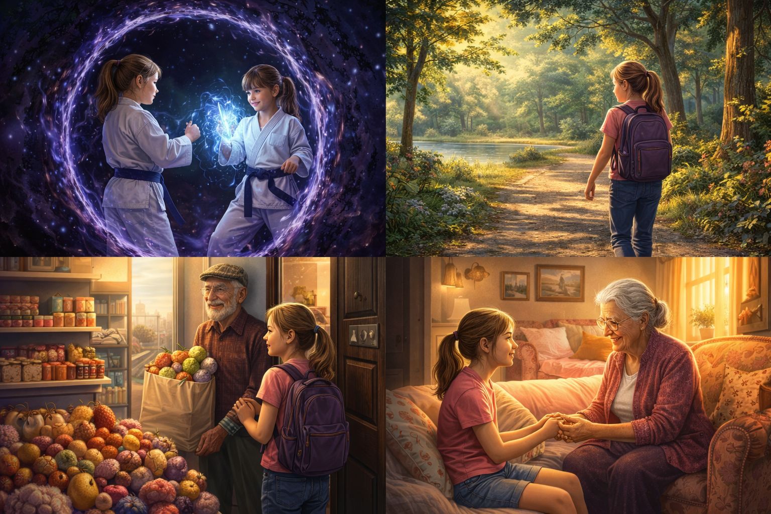 Jednog dana sam otišla u Maksimir i vidjela jedna čudna vrata. Bila su kao crna rupa. Ušla sam. Unutra sam vidjela djevojčicu koja mi je rekla da ona ima moć. I onda sam je pitala kakve su njene moći. Odgovorila mi je da je imala natjecanje u karateu te se borila protiv loših ljudi . Svojim moćima je mogla obraniti ljude kada im je to potrebno.
