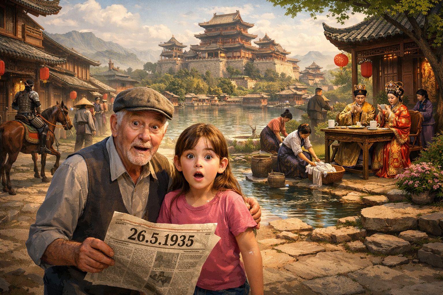 Jednog lijepog sunčanog dana išla sam s djedom u šetnju. Hodali smo oko jedne lijepe zgrade. Kad smo došli do polovice zgrade vidjela sam nešto neobično. Izgledalo je kao portal. Djed i ja smo ušli kroz ta neobična vrata. Ona su nas odvela u prošlost Kine. Vidjeli smo ljude odjevene u neobičnu starinsku odjeću, stare kuće, ljude na konjima, nije bilo automobila…Djed i ja smo se pogledali i nije nam ništa bilo jasno. Okrenuli smo se da provjerimo je li iza nas i dalje zgrada oko koje smo šetali, ali nije bilo ni zgrade ni portala kroz koji smo maloprije prošli. I dalje smo stajali i u nevjerici promatrali svijet oko nas, kada je do nas doletio list novina na kojima je pisao datum 26.5.1935.g. Taj portal nas je odveo u 1935. godinu. Djed i ja smo se prestrašili. Nismo imali kartu Kine, nismo znali gdje se nalazi sjever, jug, istok ili zapad. Bili smo izgubljeni. U daljini smo vidjeli dvorac i odlučili prošetati do njega. Potajno smo ušli u dvorac jer smo uočili vojnike i sluge i prestrašili se da ćemo imati problema, ali kasnije smo shvatili da oni nas uopće ne vide jer mi nismo iz njihova doba. Za njih smo bili nevidljivi. Bili smo sretni zbog toga odlučili se tamo zabavljat. Vidjeli smo kineskog cara i caricu kako piju čaj. Vidjeli smo sluge kako peru odjeću u jezeru pored dvorca. Vidjeli smo prekrasne parkove unutar dvorca. Nakon nekog vremena, umorili smo se od šetnje i razgledavanja te smo se odlučili vratiti na mjesto gdje nas je portal izbacio u ovaj svijet. Isprva ga nismo pronašli, ali zbog naše upornosti, nakon nekoliko krugova portal se pojavio. Sretni smo uskočili kroz portal i vratili se u naš svijet i naše doba.